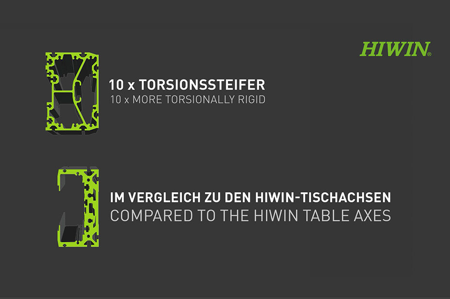 С полезен товар до 350 кг и 10 пъти по-висока устойчивост на усукване в сравнение с осите за маса на HIWIN, най-тежките товари могат да се движат свободно и на големи разстояния. Дали за бърза манипулация и точно позициониране на големи автомобилни компоненти, големи дървени и стъклени компоненти или за динамичен и повторяем монтаж с висока производителност на батерийни модули, в опаковъчната промишленост или в верижни и товаро-разтоварни системи – могат да се реализират безброй приложения за тежки товари.